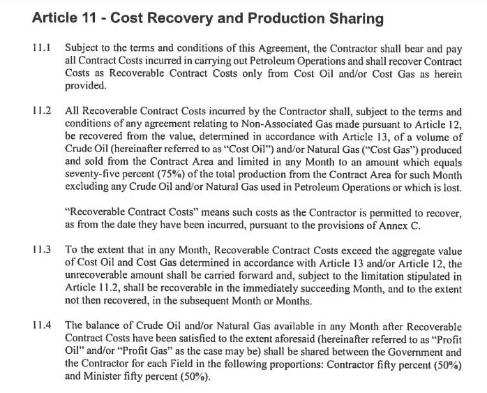 The contract allows Exxon to deduct 75 percent of the resources each month to cover expenses to develop oil and gas projects. The 25 percent is then shared evenly (50/50) between the government of Guyana and the oil company.