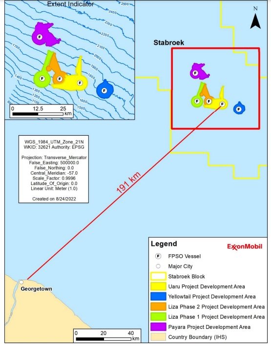 The project is located in the Uaru, Mako and Snoek fields (collectively referred to as the Uaru field) approximately 191 kilometres or about 119 miles northeast of the coastline of Georgetown in waters approximately 1,700 to 1,900 metres (5,577 to 6,234 feet) deep.