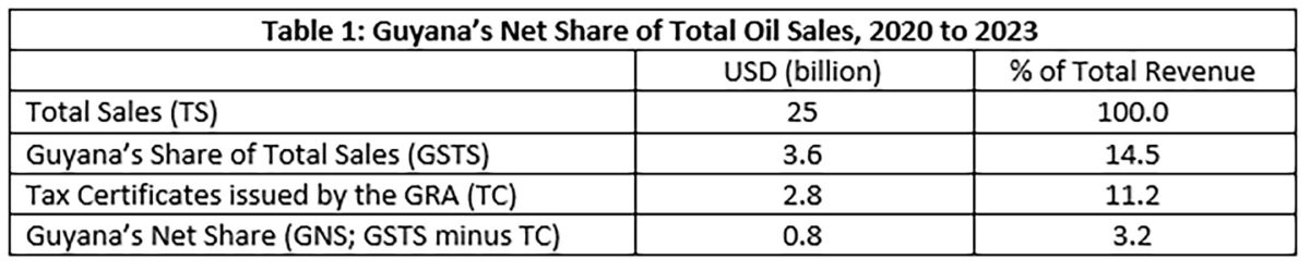As a result, rather than paying corporate income taxes directly, ExxonMobil and its affiliates, benefit from Guyana’s tax payments, amounting to Tax Certificates issued to the value of approximately USD 2.8 billion from 2020 to 2023 (Table 1; adapted from Ref. 3, 1 USD = 208.5 GYD). This practice means that 78% of Guyana’s total oil revenues (USD 3.6 billion) were earmarked to cover taxes on behalf of foreign corporations. This leaves Guyana’s net share of total oil sales in real terms at a meagre USD 0.8 billion (3.2% of Total Oil Revenue).